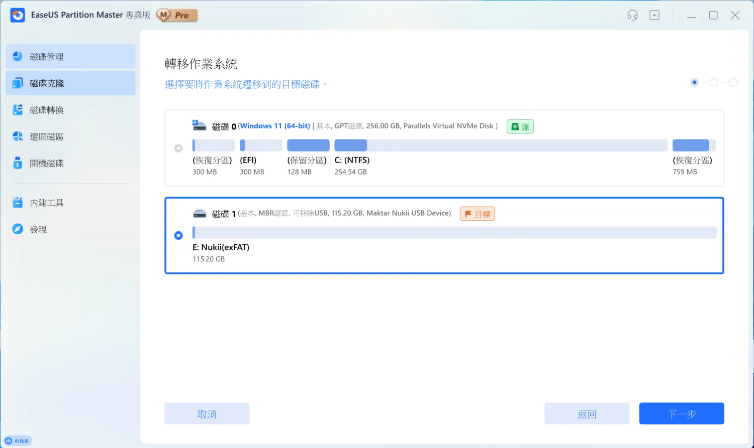 很多人想把電腦從傳統硬碟升級到 SSD,但又不想重灌系統。重灌不只麻煩,所有軟體都要重新安裝,設定也要重新調整。EaseUS Partition Master 的「轉移作業系統」功能,就是專門解決這個問題。在「磁碟克隆」功能裡選擇「轉移作業系統」,軟體會自動偵測電腦上的所有硬碟。來源磁碟會顯示作業系統版本(這裡是 Windows 11 64-bit),目標磁碟則要選擇新的 SSD 或硬碟。
