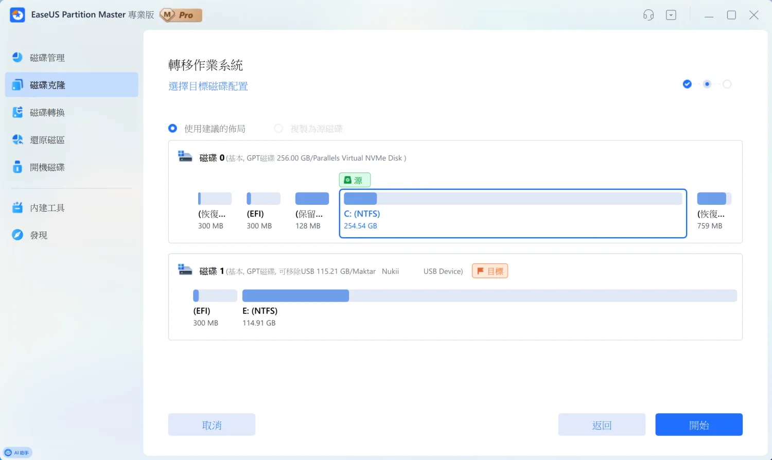 選好目標硬碟後,軟體會顯示建議的分割區配置。如果目標硬碟容量比較小,軟體會自動調整分割區大小;如果比較大,也可以選擇保持原始配置或是自動擴充。