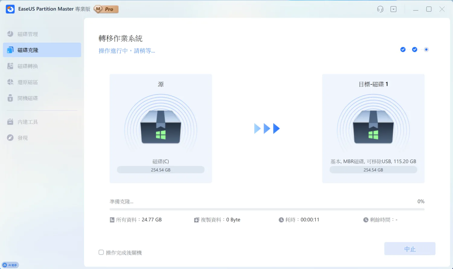 按下「開始」後,就會看到轉移進度。畫面會顯示總資料量、已複製的資料、耗時和剩餘時間。如果資料量很大,可以勾選「操作完成後關機」,讓電腦自動關機,不用一直等著。