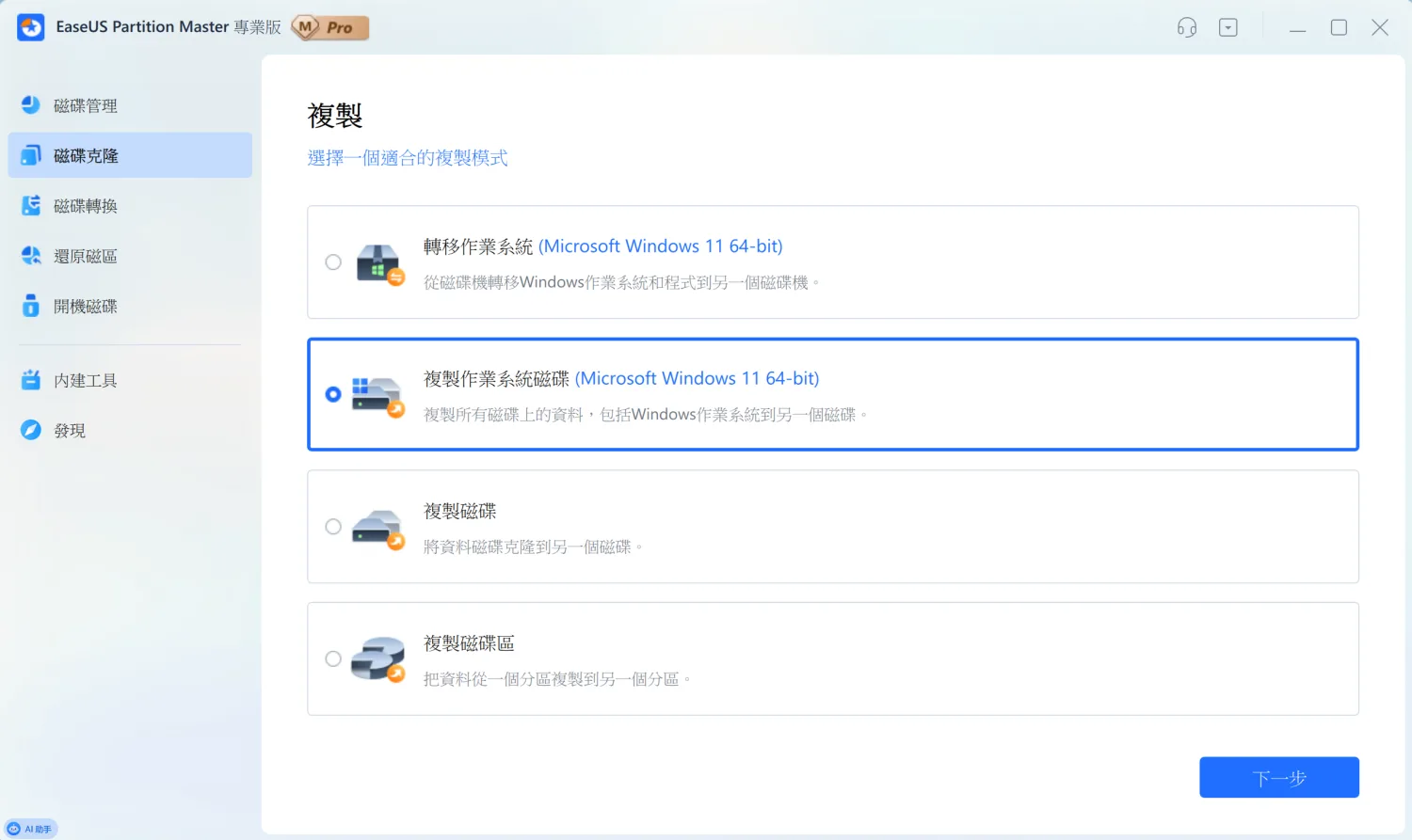 除了轉移作業系統,軟體還提供其他克隆選項。「複製作業系統磁碟」會連同所有分割區一起複製;「複製磁碟」適合整顆硬碟對拷;「複製磁碟區」則是只複製特定分割區。根據需求選擇就好。