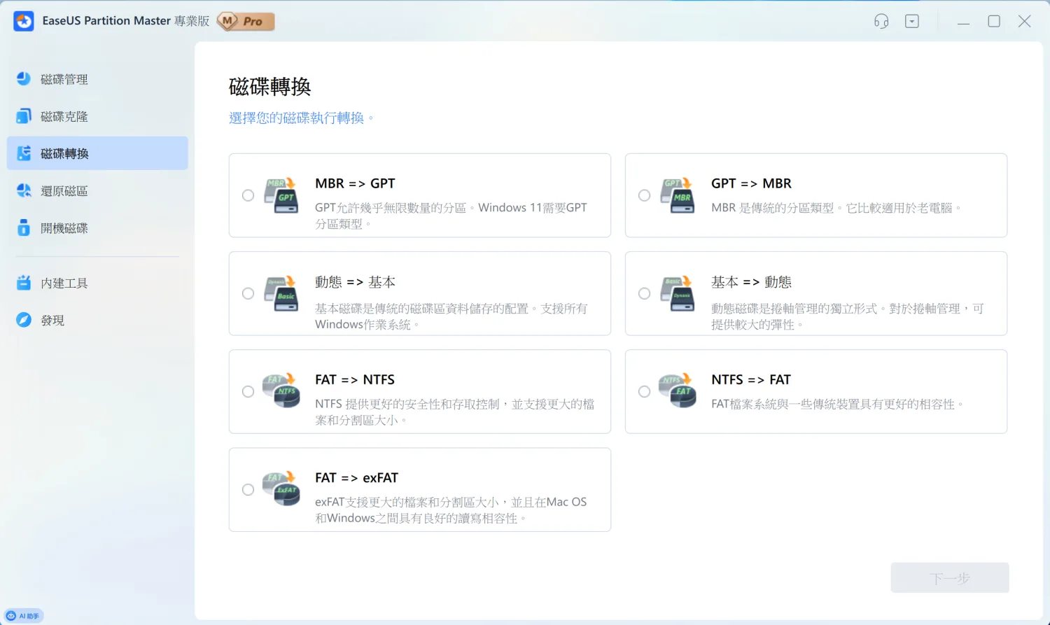 Windows 11 強制要求 GPT 分割表,但很多舊電腦還在用 MBR。以前要轉換格式,只能備份資料、刪除分割區、重新建立,非常麻煩。EaseUS Partition Master 可以直接轉換,不會影響資料。 在「磁碟轉換」功能裡,可以看到多種轉換選項。MBR 和 GPT 可以互轉,動態磁碟和基本磁碟也能互轉。檔案系統方面,FAT32、NTFS、exFAT 之間都能轉換。每個選項都有說明,告訴你適用的情境。像是 MBR 轉 GPT 的說明就寫了「Windows 11 需要 GPT 分區類型」,而 GPT 轉 MBR 則註明「適用於老電腦」。這些提示對不熟悉技術的人來說很有幫助。