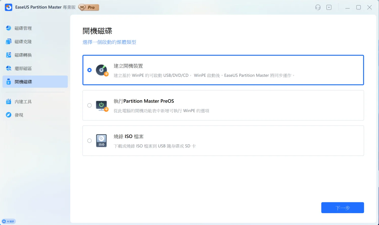 如果電腦完全開不了機,連 Windows 都進不去,這時候就需要開機救援碟。EaseUS Partition Master 可以製作一個 WinPE 開機隨身碟,讓你在系統掛掉時還能執行磁碟操作。 「開機磁碟」功能提供三種方式。最常用的是「建立開機裝置」,會把 WinPE 和 EaseUS Partition Master 寫入 USB 隨身碟或光碟。開機後就能直接使用軟體,修復磁碟問題或救援資料。建議平常就先做好一個開機 USB,放在安全的地方。等到真的遇到系統崩潰,才不會手忙腳亂。