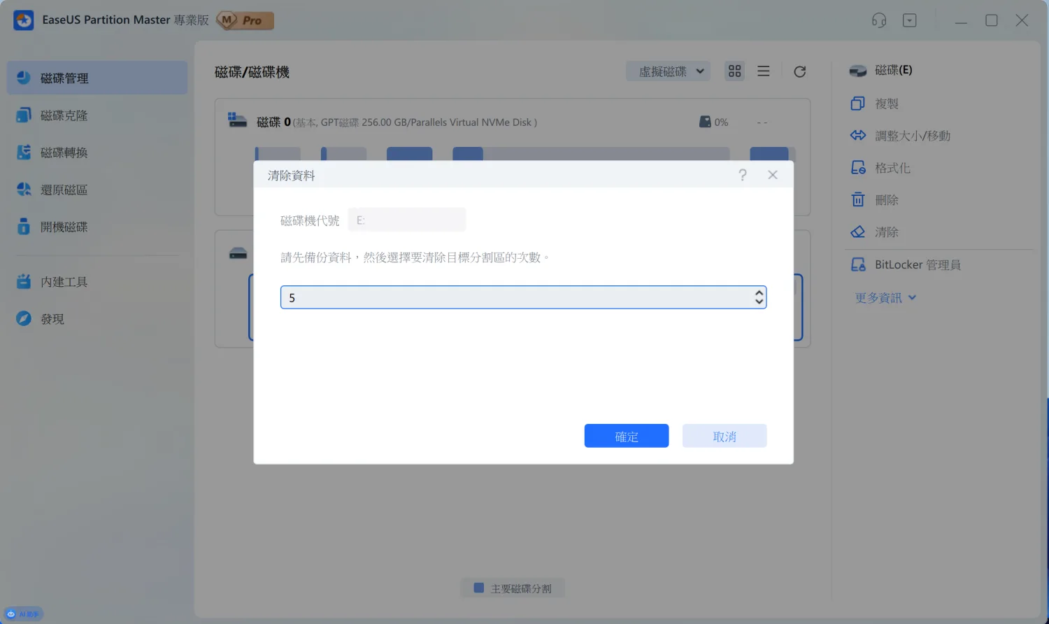 EaseUS Partition Master 的「清除」功能,可以用隨機資料多次覆寫整個分割區。設定清除次數,預設是 5 次。次數越多越安全,但花的時間也越長。一般來說 5 次就足夠了,資料幾乎不可能被還原。執行清除前記得先備份重要資料,因為清除後就真的救不回來了。這功能在處理舊硬碟時特別重要。