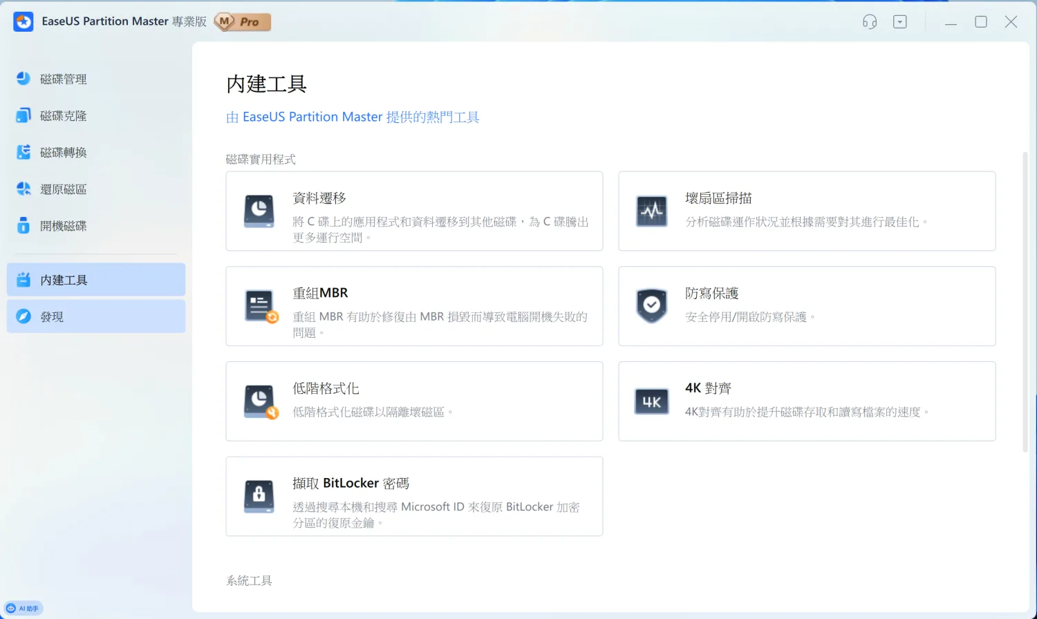 除了主要功能,軟體還內建了很多實用工具。「資料遷移」可以把 C 槽的應用程式搬到其他磁碟,釋放系統空間。「重組 MBR」能修復開機問題。「壞扇區掃描」可以檢查硬碟健康狀況。「4K 對齊」則是 SSD 優化必做的步驟,能大幅提升讀寫速度。這些工具平常可能用不到,但遇到問題時就知道有多重要。像是電腦突然開不了機,可能就是 MBR 損壞;SSD 速度變慢,可能是沒做 4K 對齊。