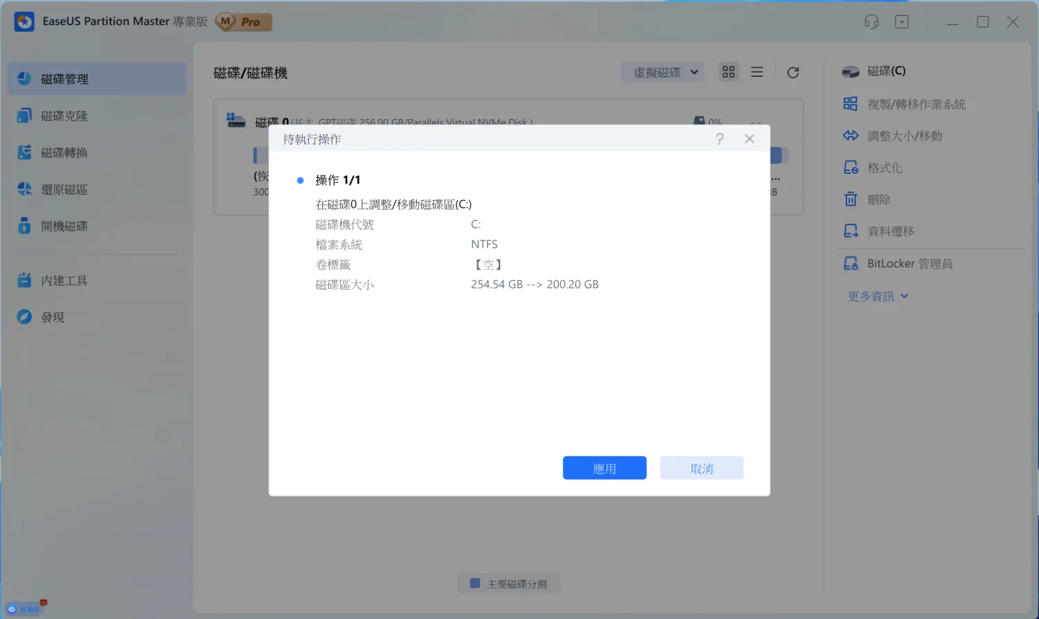 這裡我把 C 槽從 254GB 縮小到 200GB,空出來的 54GB 就變成「未配置空間」,可以拿來建立新的分割區。設定完成後,軟體會先預覽即將執行的操作。這個設計很貼心,可以避免誤操作。確認沒問題後按下「應用」,軟體就會開始調整分割區。