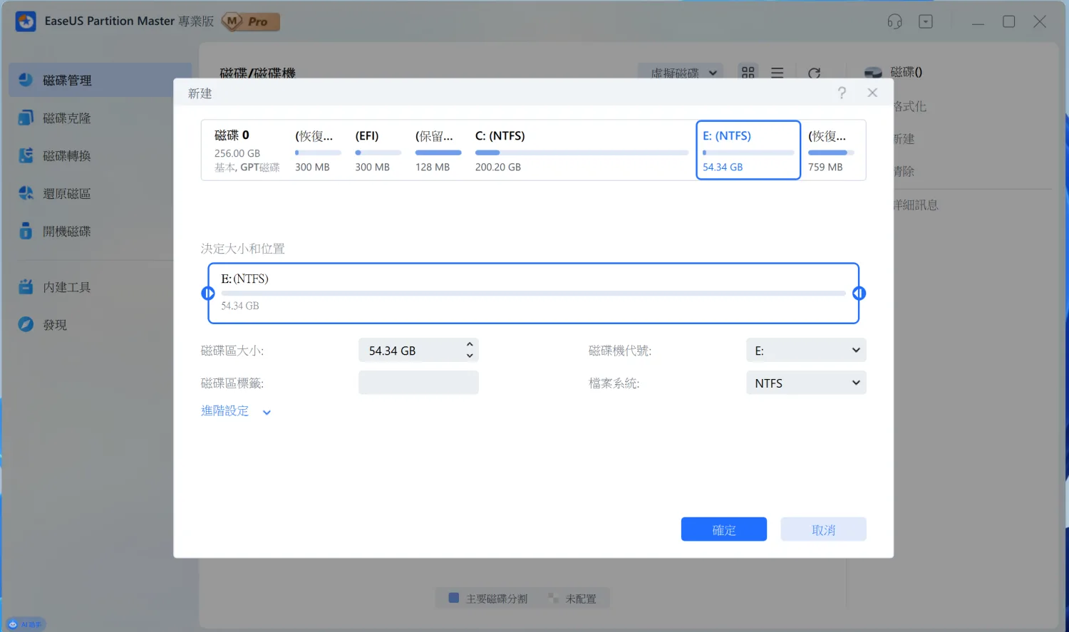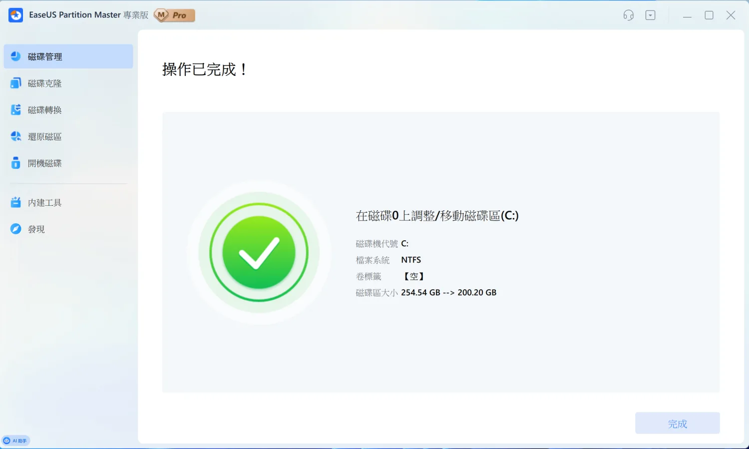 整個過程都是在背景執行,不會影響資料安全。幾分鐘後就完成了。軟體會跳出成功訊息,告訴你分割區已經從 254.54GB 調整為 200.20GB。這時候硬碟上就多出了一塊可用的空間。
