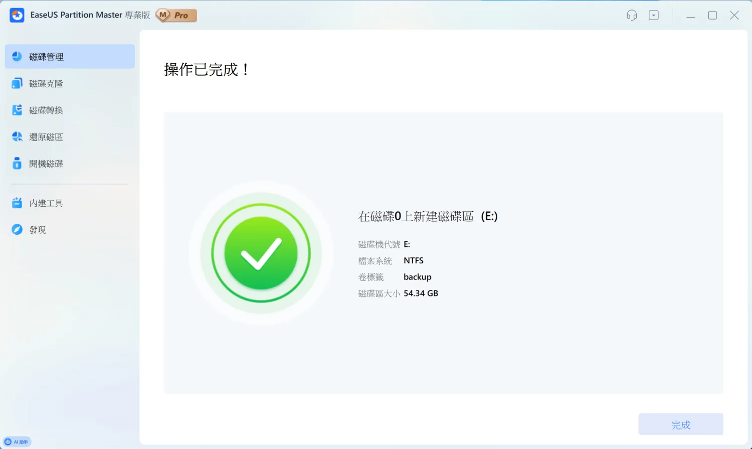 執行後就會看到成功訊息。新建立的 E 槽已經可以使用了,容量是 54.34GB,檔案系統是 NTFS,標籤名稱是 backup。