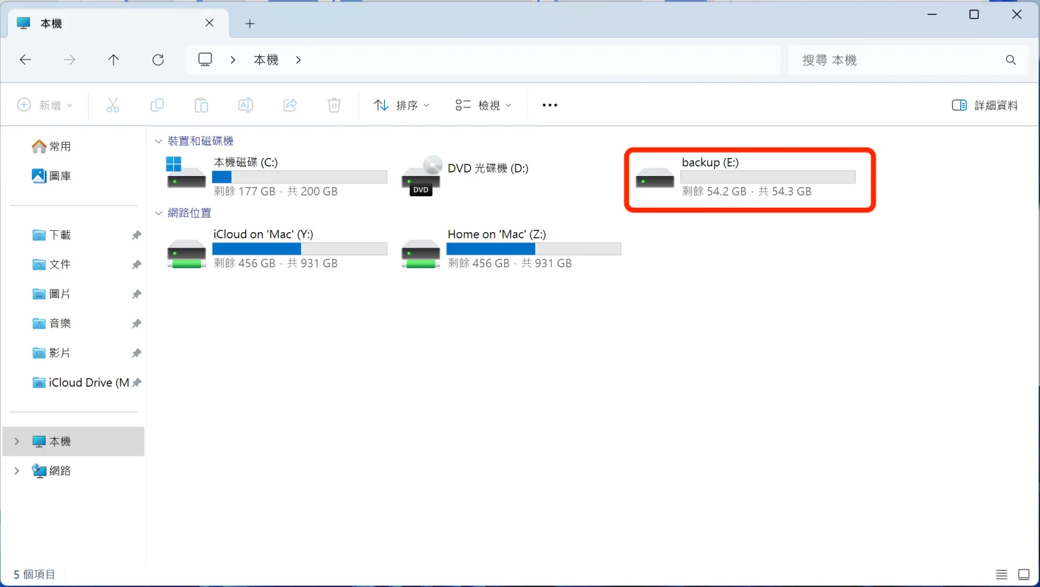 打開檔案總管,就能看到新的 backup (E:) 磁碟機已經出現了。C 槽的容量也確實變成 200GB,剩餘空間 177GB。這樣就完成了一次完整的分割區調整。
