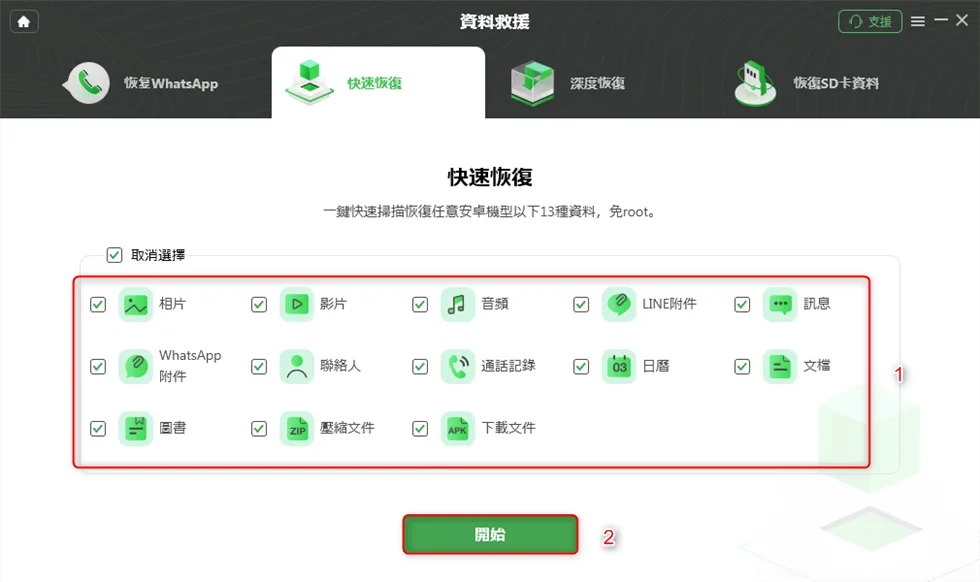 如只需找回一般資料(照片、影片、聯絡人等),選擇:「快速恢復」(速度快、無需 Root)