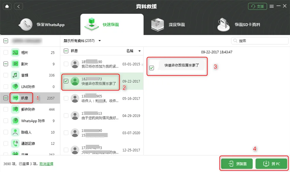 - 可恢復多種類型資料(照片、影片、WhatsApp、LINE、簡訊、聯絡人、文件等)