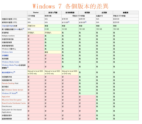 另外對Windows 7的版一堆版本有疑問的人,可以大概看看以下比照圖: